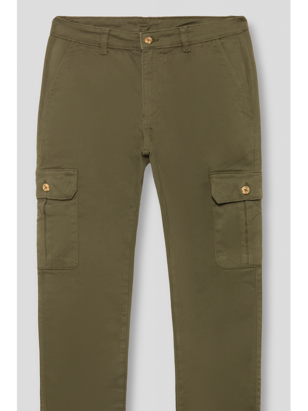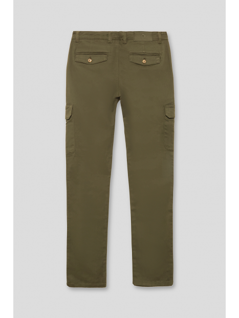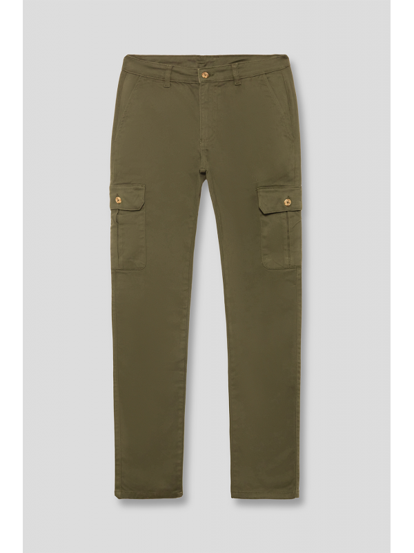 Pantalón cargo con cierre central mediante botón y cremallera. Dos bolsillos frontales y dos más bajos con cierre mediante tapeta y botón. Dos bolsillos traseros y detalle personalizado sobre uno de ellos. Corte recto.
