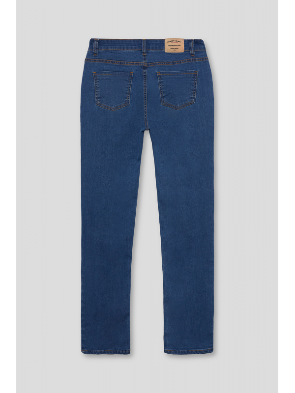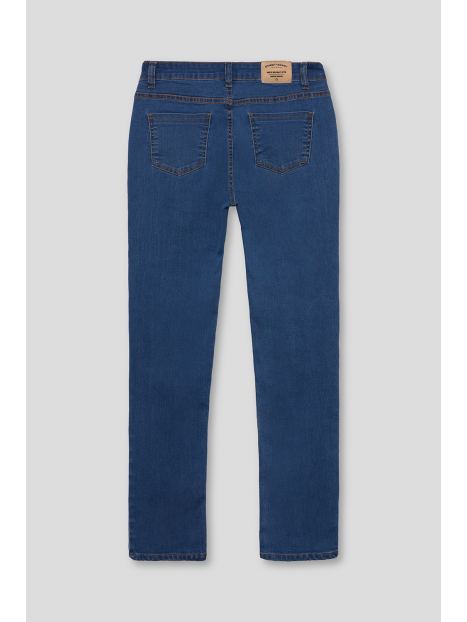 Pantalón denim de corte skinny fit con cinco bolsillos y cierre central mediante botón y cremallera, pespuntes en color camel, fornituras personalizadas y etiqueta en efecto piel en la cinturilla.