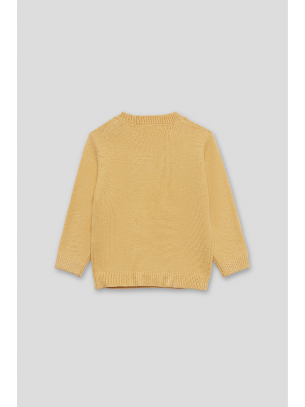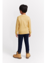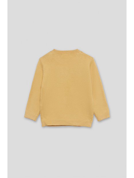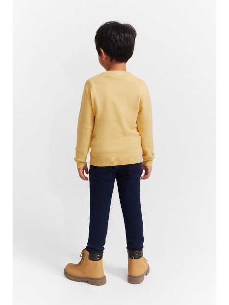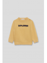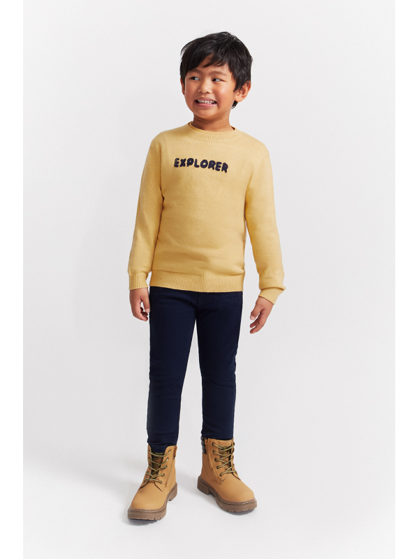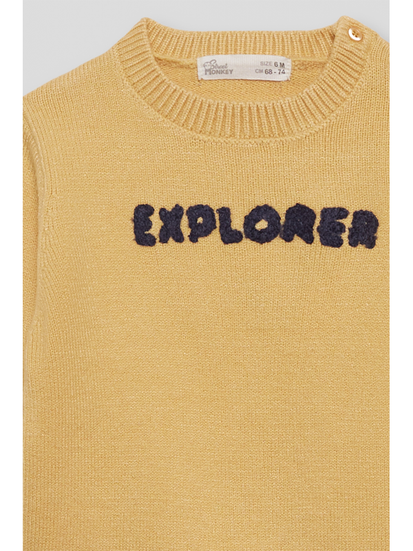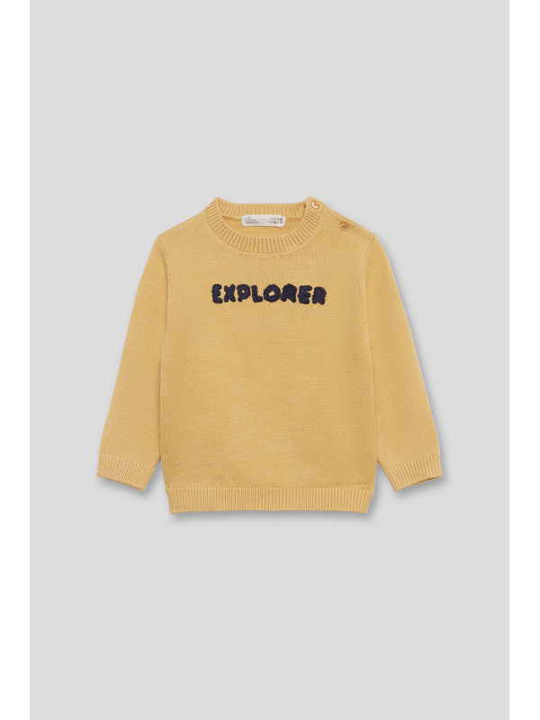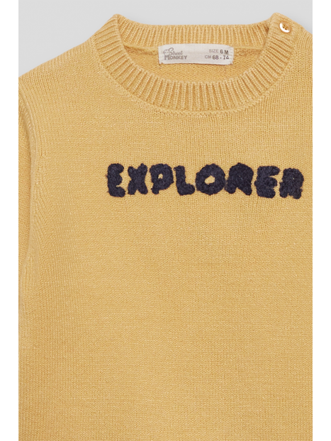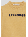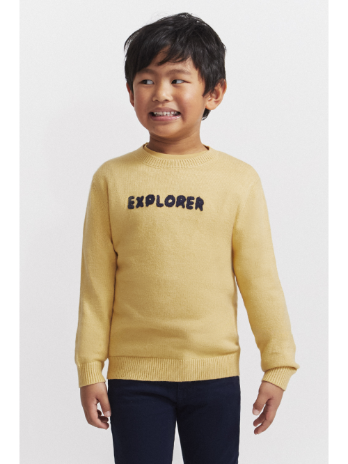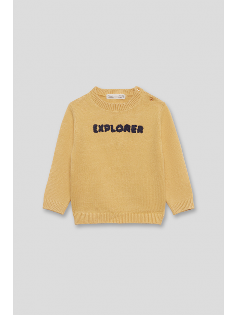 Jersey de punto en color maíz, con bordado en relieve de la palabra "EXPLORER" en tono marino en el delantero. Cuello redondo con cierre de botones en el hombro en las tallas más pequeñas para facilitar la puesta. Confeccionado en tejido cálido y suave, con remates de canalé en el cuello, los puños y el bajo. Una prenda cómoda y abrigada para los días fríos.