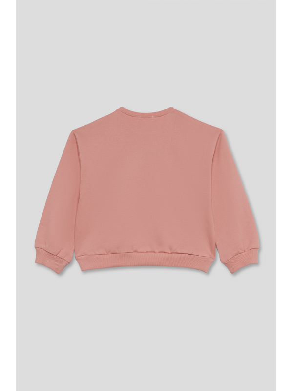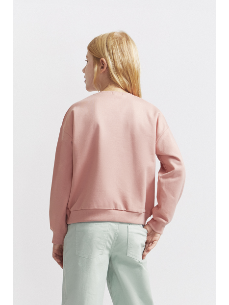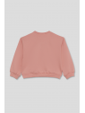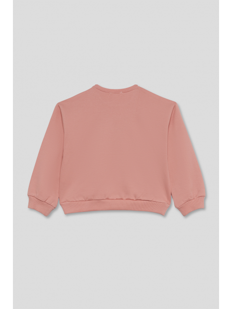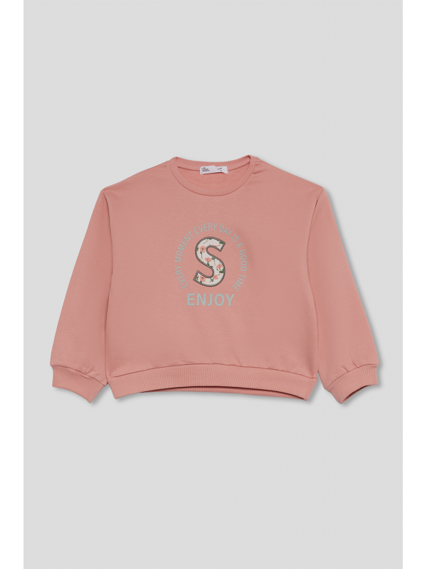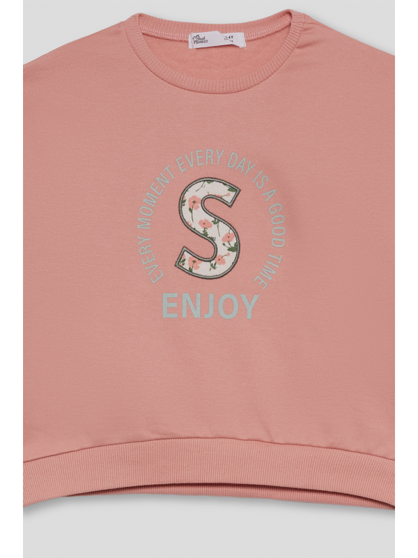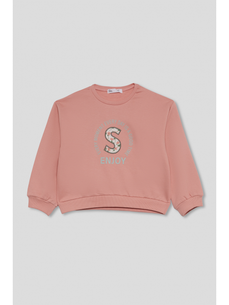 Sudadera en color maquillaje, confeccionada en punto suave con interior afelpado. Presenta cuello redondo y acabados en canalé en los puños y el bajo. El diseño incluye una gran letra “S” en el centro con estampado floral, rodeada del mensaje “Every moment, every day is a good time” y la palabra “Enjoy” en contraste.