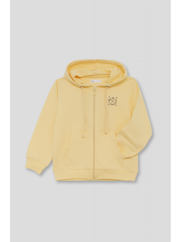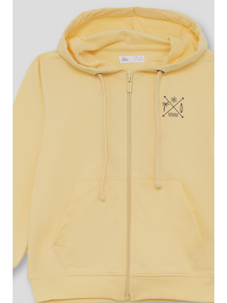 Diseño con cremallera frontal, bolsillos canguro y cordones ajustables en la capucha. Estampado minimalista en el pecho que aporta un aire veraniego y desenfadado.