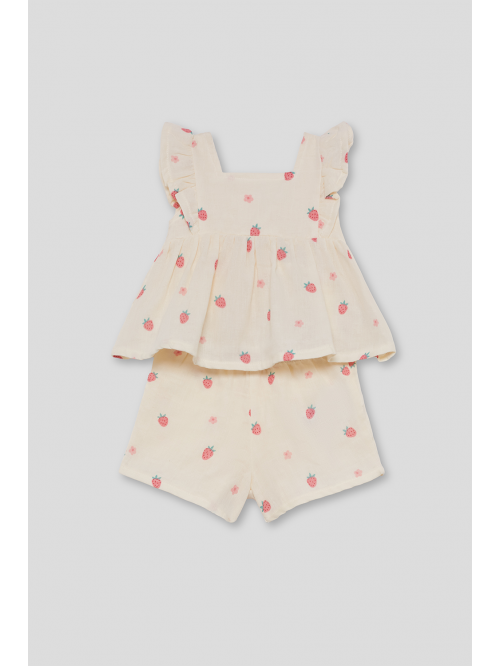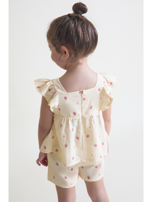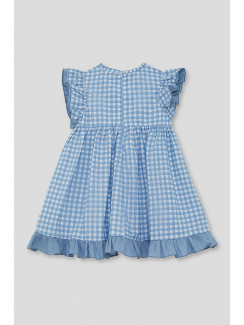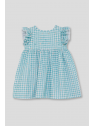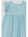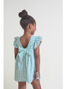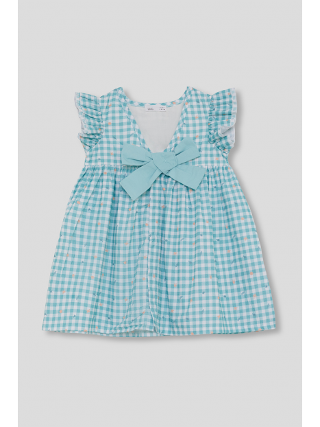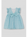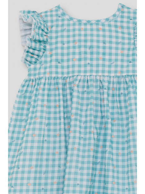 Vestido sin mangas en vichy turquesa con estampados marinos y volantes en los hombros. Lazo en la espalda y cierre trasero en tallas de meses. Tejido ligero y fresco, perfecto para los días de verano.