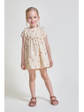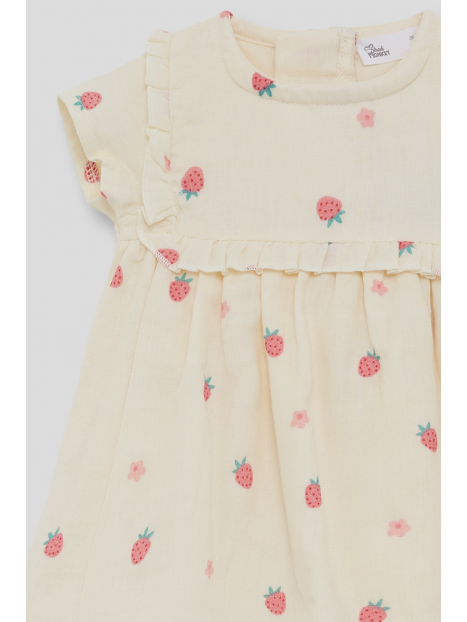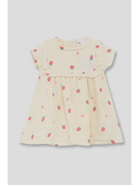Vestido para bebé niña de 3 meses a 6 años. En color crudo con estampado de fresas y pequeñas flores. Diseño con volantes en el canesú y mangas cortas, con abertura de botones en la espalda para vestir con facilidad.