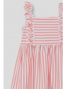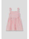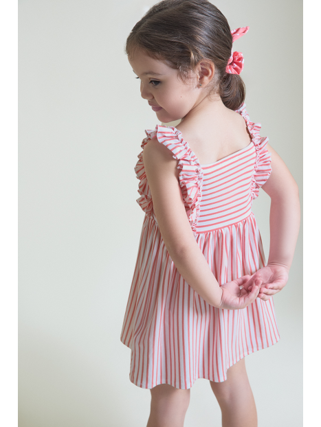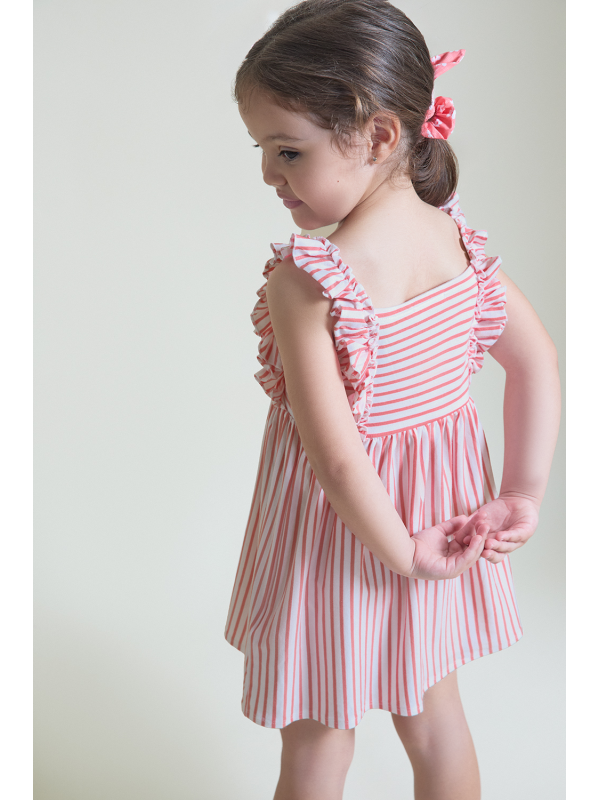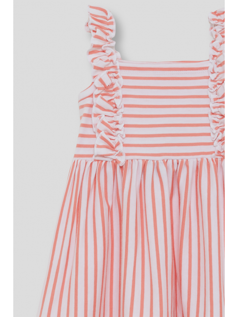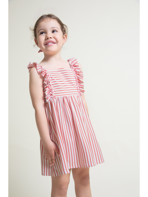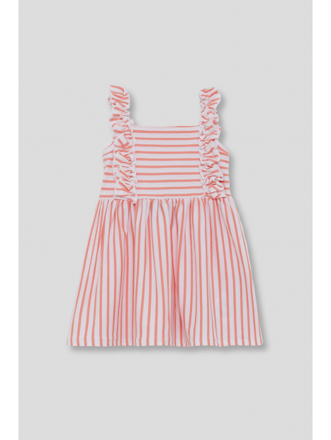 Vestido sin mangas en color coral con estampado de rayas horizontales y verticales, decorado con volantes en tirantes delanteros. Confeccionado en tejido fresco y ligero, ideal para el verano.